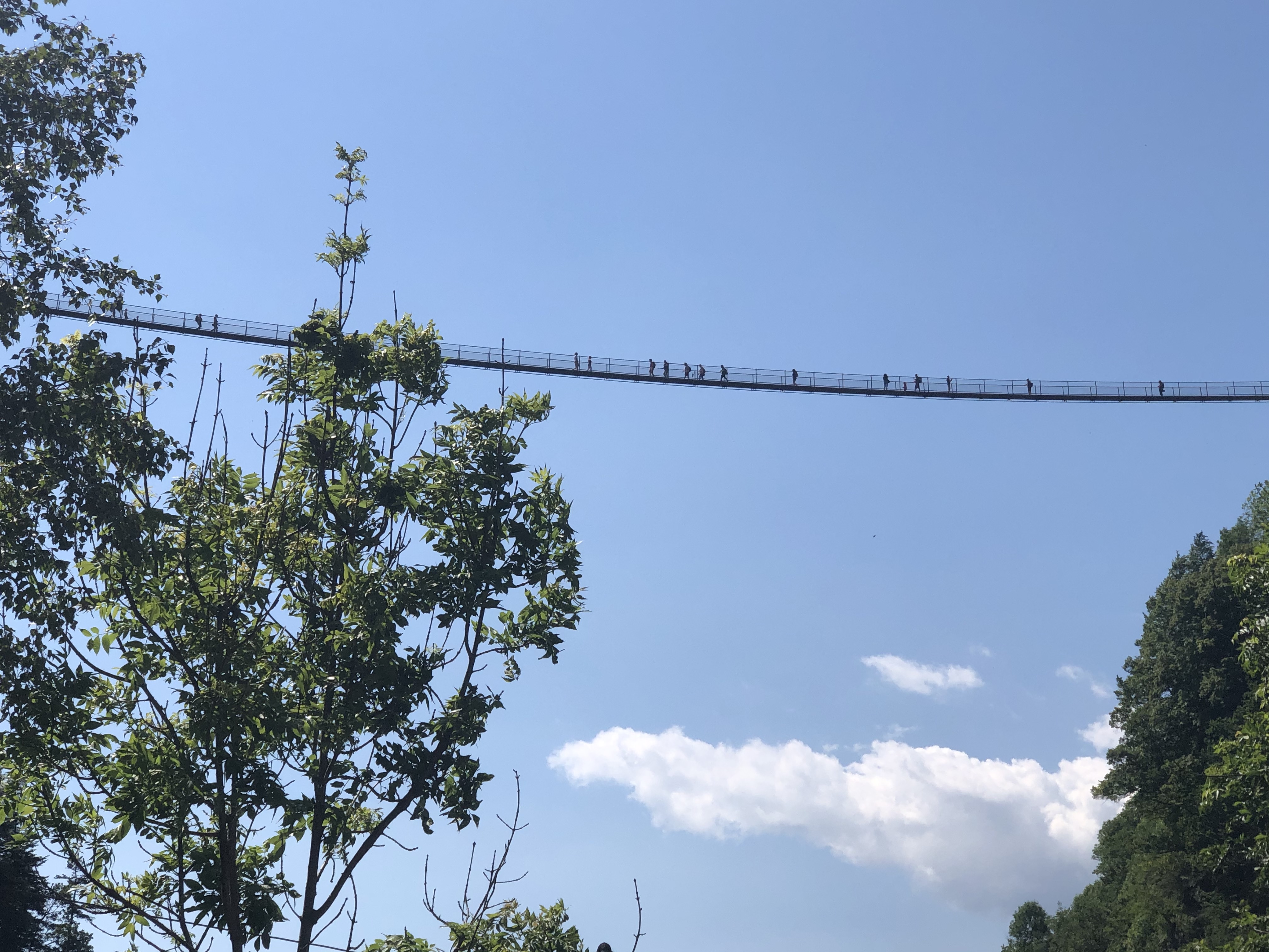 Essendo stato un ripiego, non eravamo informati su cosa avremmo potuto fare, ma una volta parcheggiato, leggiamo i primi cartelli, uno fra tanti indica “Ponte del Cielo“, e subito il nostro sguardo si perde in mezzo alla vallata dove dall’alto scogiamo un bellissimo ponte Tibetano.